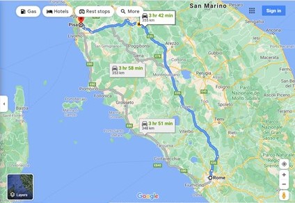 After a quick breakfast of toast, omelette, and tea, we checked out of Camping Flaminio, paying 163 Euros for two nights. Our first stop was Pisa, around 350 kilometres away.